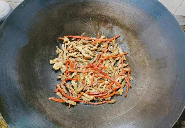 ②里脊肉洗干净,切成肉丝。去掉辣椒的蒂部,洗干净后切成辣椒丝。锅中滑油,倒入肉丝煸炒。等肉丝变色后放入蒜子、辣椒、生抽提鲜去腥增香,翻炒均匀。
