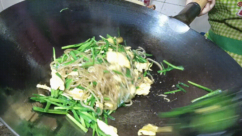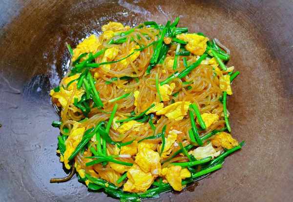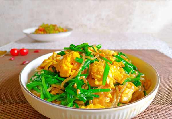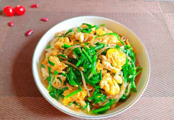 食材:韭菜100克、土鸡蛋3个、粉条100克、生抽、盐、食用油、淀粉