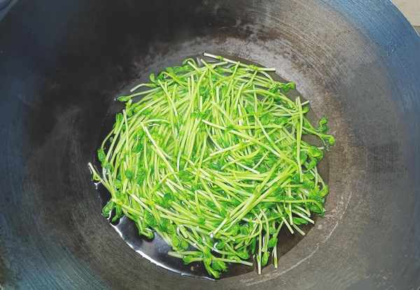 ③倒入豌豆苗,开大火炒。