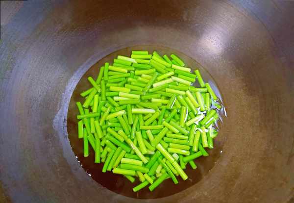 ③倒入蒜薹,开大火炒。