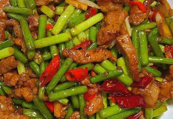准备食材:猪肉,蒜苔,蒜末,小米辣。