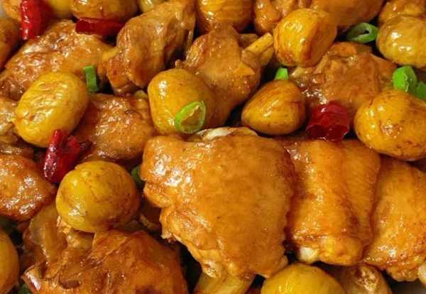 4、然后放入板栗仁和适量热水没过食材,盖上盖子焖煮半个小时。焖煮好了之后,夹出香料,开大火翻炒收汁,撒上葱花即可出锅装盘开吃。