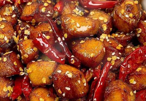 3、锅中留底油,放入蒜末、干辣椒、花椒,翻炒出香味,然后放入炸过的鸡丁翻炒,炒入味后撒上白芝麻即可出锅装盘开吃。