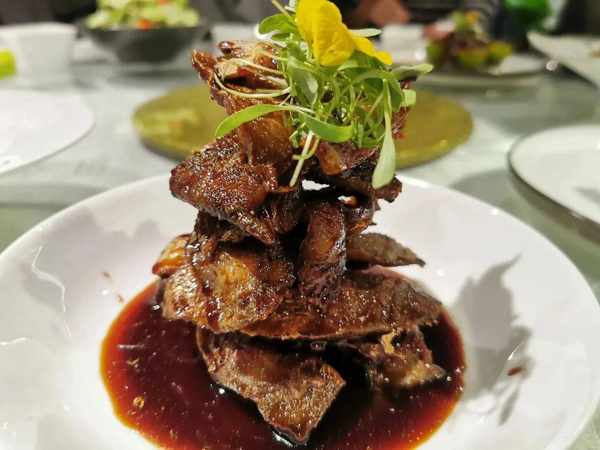 本帮熏鱼作为上海的招牌冷盘,在这却有着别样的制作工艺。主厨将冷菜热做,并特别选用鲳鱼代替传统的青鱼,品尝起来更鲜美、肉质更细。油炸后的鱼块鱼皮带有丝丝的干香和韧劲,内部的鱼肉却还保持了原有的鲜嫩,咸香中带着甜,让食客回味连连。