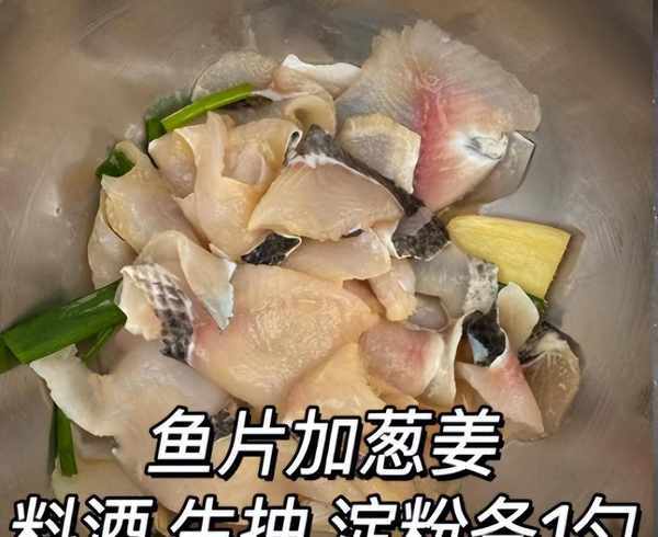 第三步:鱼片用少许料酒去腥,加上一些姜片和葱段,加上原味生抽一勺,加上少许食盐腌制,最后加上淀粉一勺,将鱼肉反复抓均匀,形成一层薄膜,锁住鱼肉的营养,让鱼肉更嫩一些。