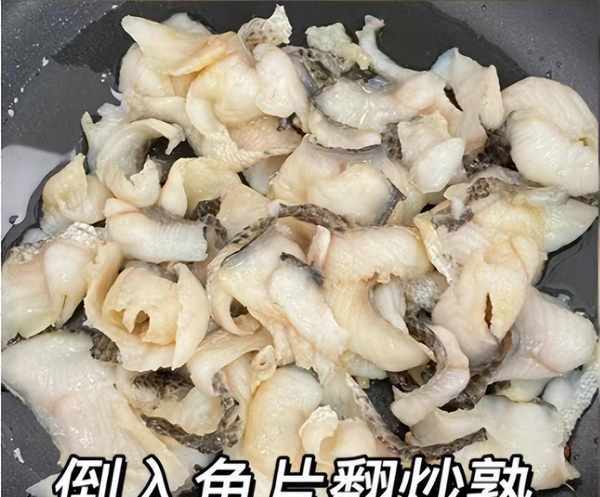 第五步:倒入腌制好的黑鱼片,大火快速将其炒熟,加上一小勺料酒去腥,加上生抽一勺,半勺老抽,加上半勺食盐和白糖,迅速翻炒均匀。