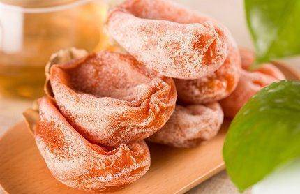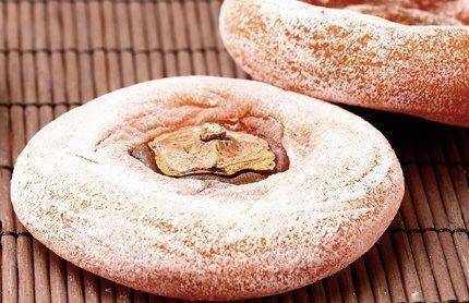 6、柿霜:买来的柿饼上面。都有一层白白的东西。那是晒完柿饼后,通过密封等工序由柿饼自身反出的霜,又叫出霜。如果要生成柿霜的话,必须要低温环境才好。将晒干捏成型的柿饼放置在阴凉干燥的室内,在低温下会慢慢的生成柿霜。柿子饼是不能晒的太干,软软的才能捂出霜。