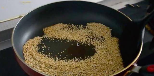 接下来就可以关火了,然后另起一锅,把准备好的芝麻放入锅中,一定要注意是小火,不然芝麻一定会糊掉的。芝麻可用作烹饪原料,如作糕点的馅料,点心、烧饼的面料,亦可作菜肴辅料。芝麻虽小,但它里面所含有的营养成分却很多,也可以有利于身体健康。但是在这道菜中,芝麻的作用可不小哦!