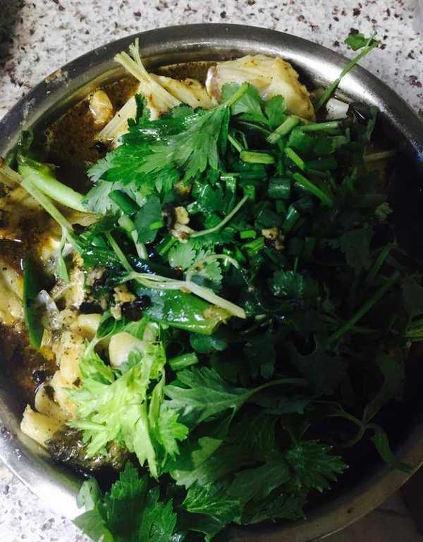 9、等到鱼肉都已经加入里面以后两分钟就可以起锅了,倒在铺好菜的碗里再加入香菜和小葱。