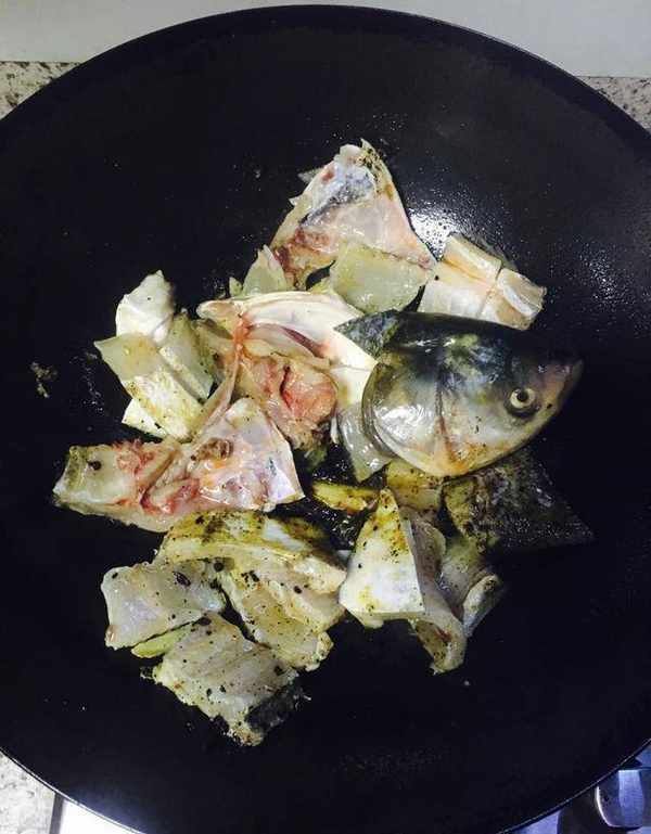 4、直到锅里面看是有香味出来了以后,就把姜和鱼骨鱼头加入到锅中去。要一直煮,直到里面的鱼肉看起来有一些白了即可。