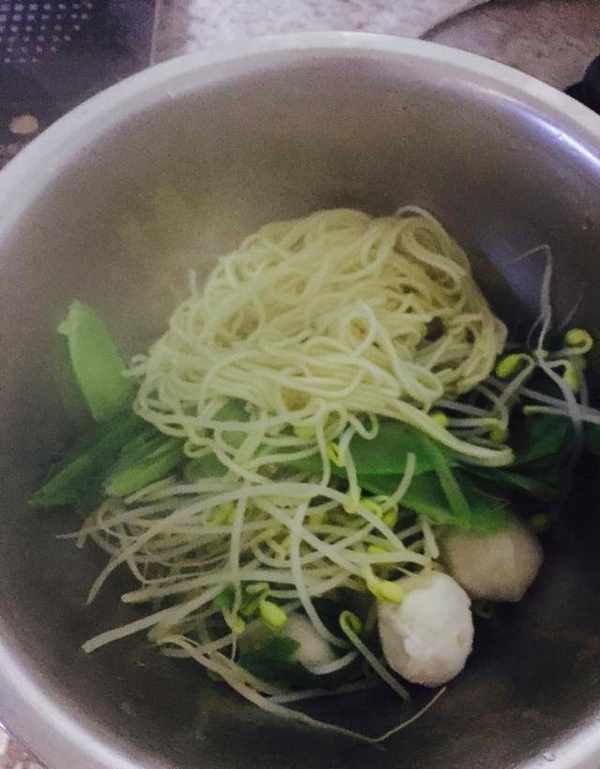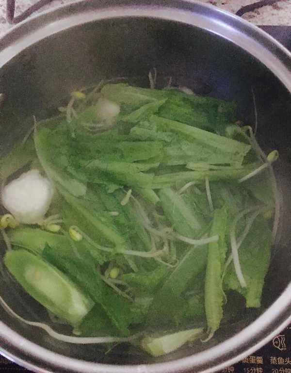6、另外准备一个锅,加入水烧开了以后把洗好的豆芽和油麦菜加入进去,煮好了以后捞出来。剩下的一些水就把面条加入到里面煮熟。