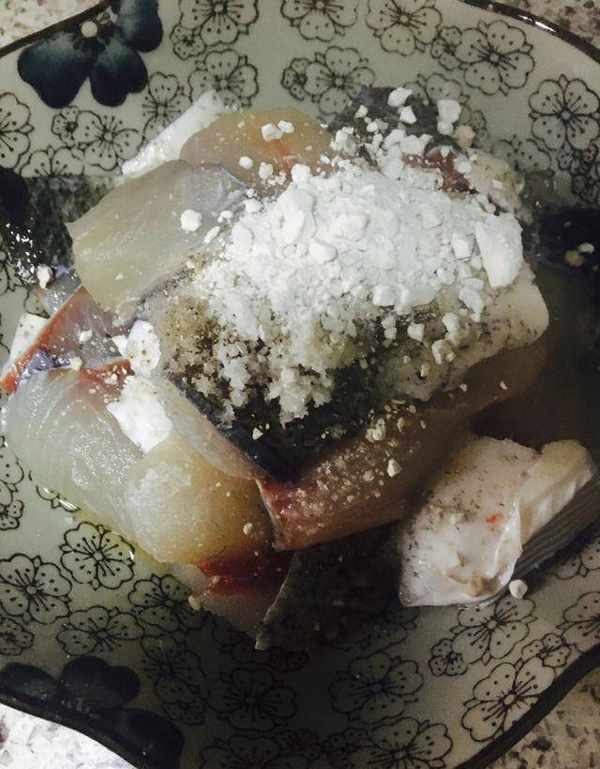 2、在鱼片上加入一点的料酒、盐、胡椒粉、淀粉和半个蛋清,再搅拌均匀了腌制一下。