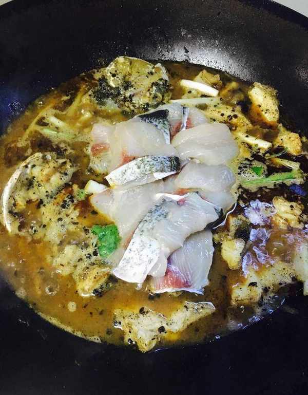 8、装鱼的锅里五分钟以后等到水打开了以后把鱼片放入到里面以后,尝一下味道。