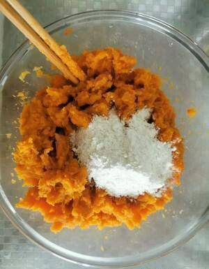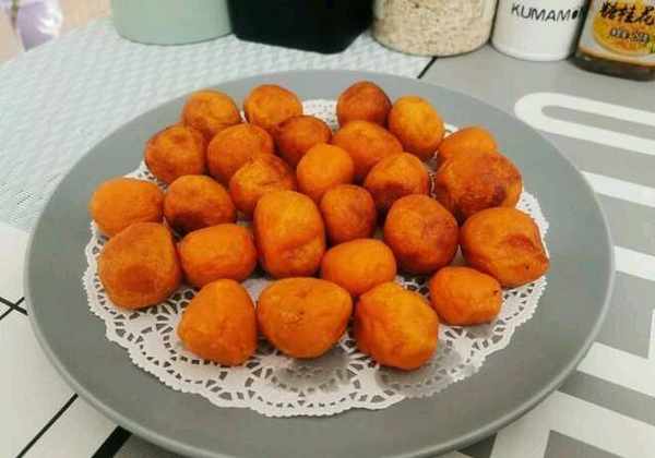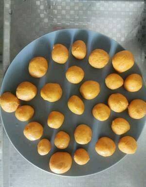 3、随后,揉成大小一致的小圆团。最后在锅里面加入油,先让油加热到一定的温度。再把弄好的球一个一个加入到锅里去油炸。