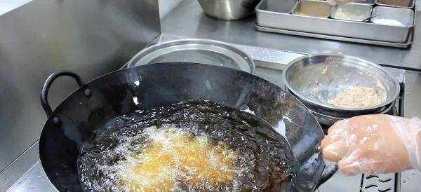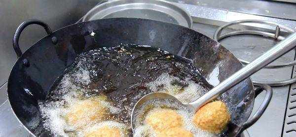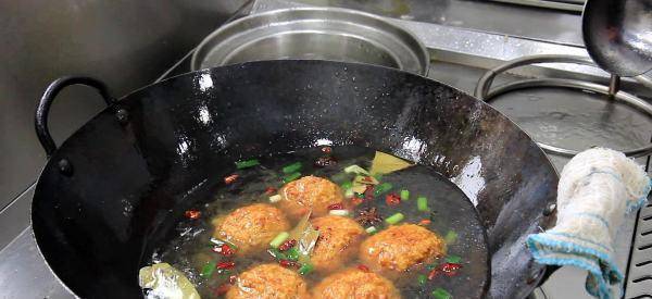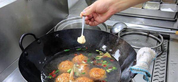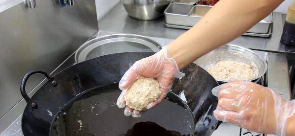 5.接下来,我们把肉馅团成肉丸放在锅里炸:锅内烧油,油温六成热时,温度180度,把肉馅放在手中,双手左右晃动肉馅,团成一个肉丸子。