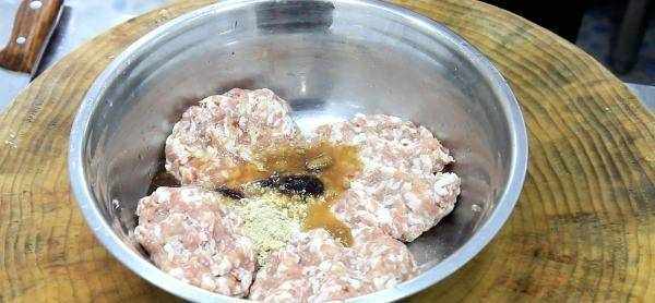 2.下面,我们调一下肉馅:肥瘦相间的肉馅500克,放入食盐2克、鸡粉2克、胡椒粉2克、十三香2克、蚝油3克、料酒5克、用手搅拌顺着一个方向给肉馅入味,并摔打上劲。