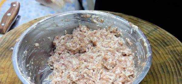 3.然后倒入葱姜水,继续顺着一个方向搅拌,这个过程要持续3分钟左右,倒入葱姜水是为了给肉馅进一步的入味,还能使肉馅水分充足。