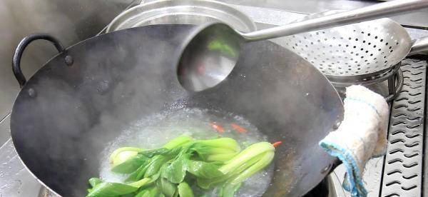 10.二十分钟以后,掀开锅盖,倒出四喜丸子和汤汁,锅内再烧水,我们把青菜焯一下水,水烧开以后放入青菜,再加入食盐2克,淋入少许植物油,放入植物油可以保持青菜的翠绿,等到青菜焯熟,倒出控水备用。