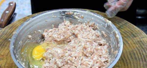 4.搅拌均匀以后,打入一个鸡蛋,放入玉米淀粉15克,放入鸡蛋和淀粉,都是使肉馅的口感更加滑嫩,使肉馅结团,不易散开。继续顺着一个方向搅拌均匀以后,放置腌制十分钟左右。