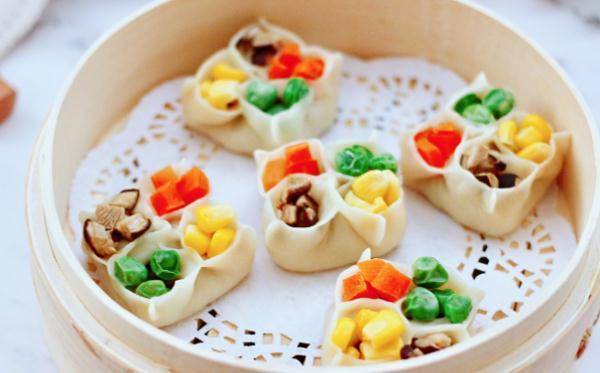 四种馅料放到蒸饺的四个大角里面,颜色特别漂亮