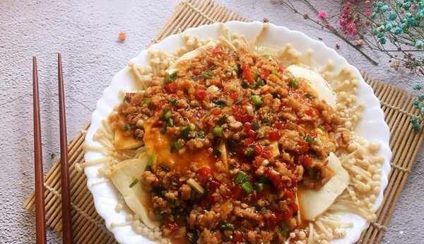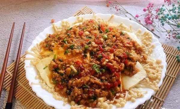 8、然后将蒸好的金针菇取出来,把里面的汁水倒掉,因为里面会有斗星和生涩的味道。再将肉末和勾芡汁均匀地淋在豆腐上面就可以开吃,吃的时候搅拌均匀。