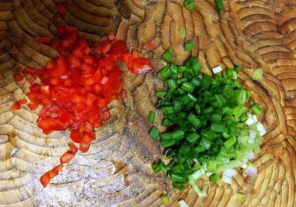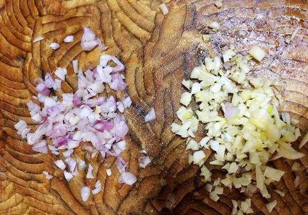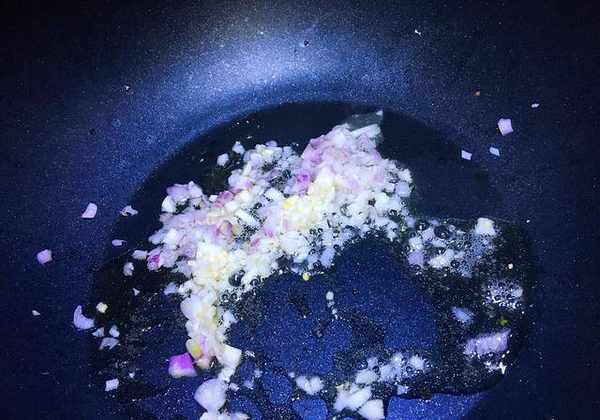 5、红椒洗干净了,七成小丁葱洗净切成葱花,然后在锅里面倒入一点油,烧热以后把蒜末和红葱头放入在里面进行爆香。