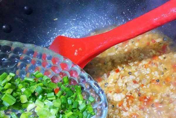 7、接下来加入红椒丁翻炒一下,再加入盐和鸡粉进行调味,翻炒均匀以后加入水淀粉进行高倩关火之后再加入葱花,在里面拌匀了就可以了。