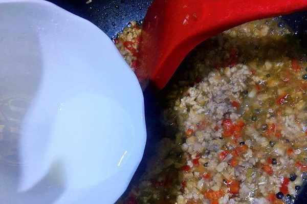 6、接下来将肉末倒在锅里面快速地划散炒至变色,然后需要在锅里面。加入料酒和生抽翻炒一下之后加入一勺的高汤煮开。