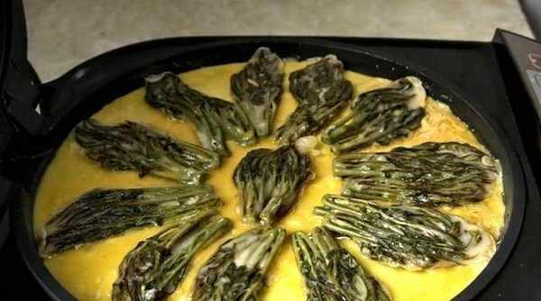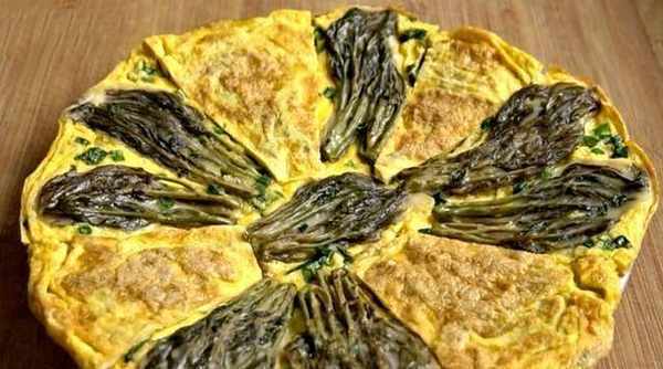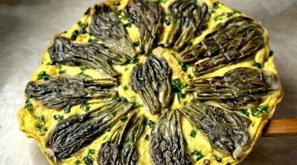 第三:把调好的鸡蛋液倒在锅里,把鸡蛋液摊平整,紧接着把香椿放进去,撒上点葱花点缀,因为香椿是熟的,只要是把鸡蛋烙熟,这样就可以出锅了。