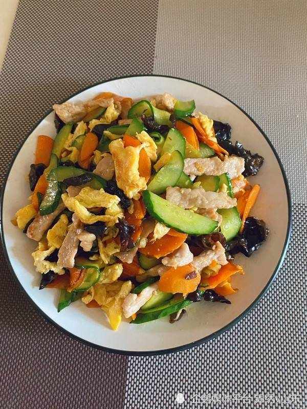 ②再添些油,油热后下花椒,待花椒变色出香味后把花椒捞出,放肉片翻炒,断生后放葱、姜、蒜末儿、酱油翻炒,上色后把鸡蛋、木耳、黄瓜倒入继续翻炒,加少许盐,也可以加点汤或水,最后放些鸡精,炒匀出锅。