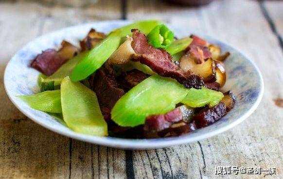 4.再倒入莴笋快速翻炒即可关火出锅,不用另外放盐,腊肠里已含有咸味。