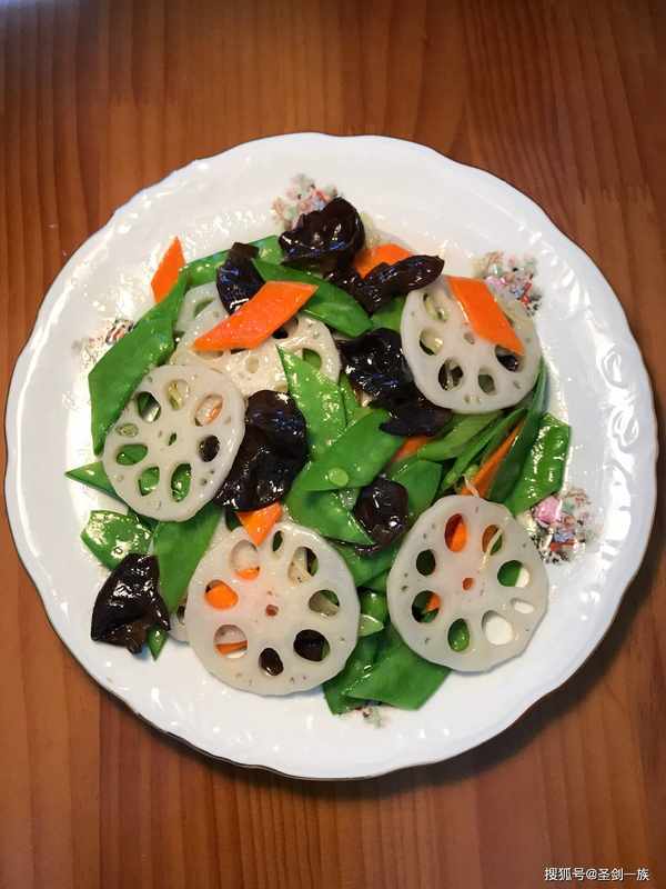 4、开火热锅倒入食用油,一起倒入藕片,甜豆,胡萝卜,煸炒一下,加入黑木耳继续煸炒!然后放入料酒,少许食盐、鸡精,翻炒几下,加少许明油就可以出锅啦