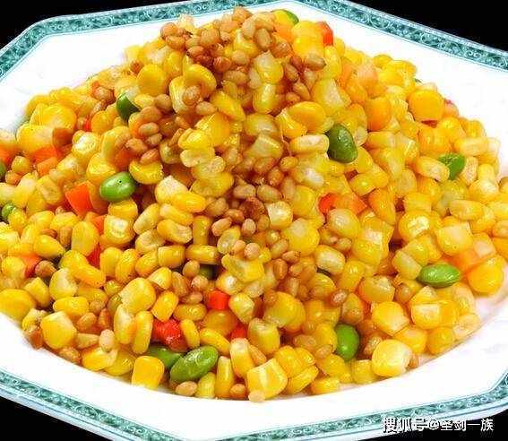 准备:①好新鲜玉米、胡萝卜、豌豆、松仁。豌豆可以替换成黄瓜。