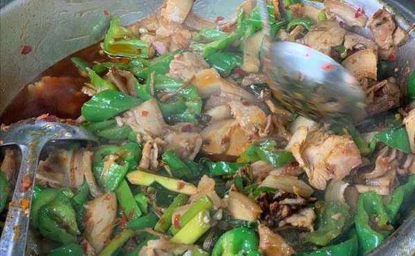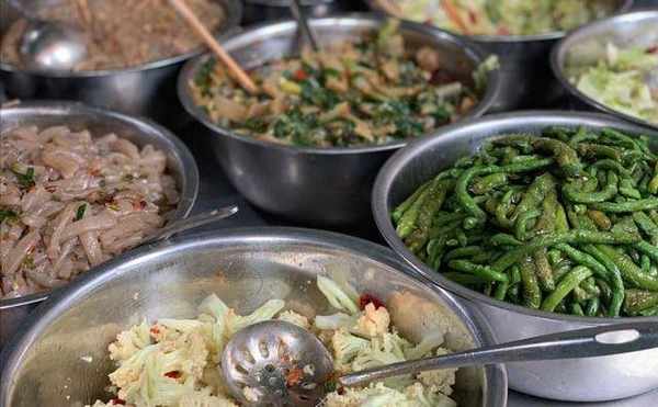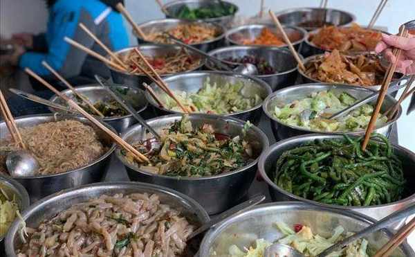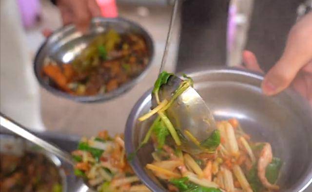炒菜是阿姨一人在做的,每一锅菜炒出来,就盛到大盆里,客人可以随意加菜,吃饱为止。阿姨设施并没有很高级,也没有加热的灶台,但是似乎也没必要,一个菜炒出来很快就被抢光了,炒锅在阿姨的手里就像滚筒一样不停地工作着,所以菜品也不固定,好奇的客人总是喜欢在锅边守着看下一个炒的是什么菜。