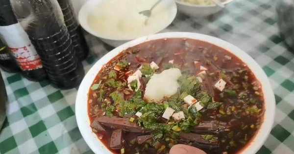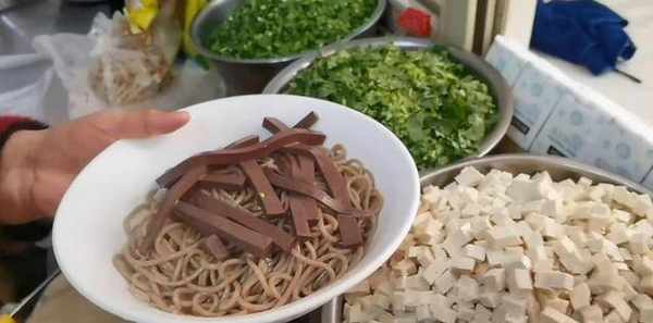这个红汤做起来也不容易,首先要把肉先浸熟,然后在放骨头和鸡架熬,而且这个锅一直都是加热的,所以熬出来的辣子汤,看着红彤彤的,闻起来也很香。老板把汤放到碗里面以后,还要加一些配菜,比如羊血、香菜、韭菜、辣子、豆腐,喜欢吃蒜泥的还能多要点,然后搅拌均匀就能够开吃了。