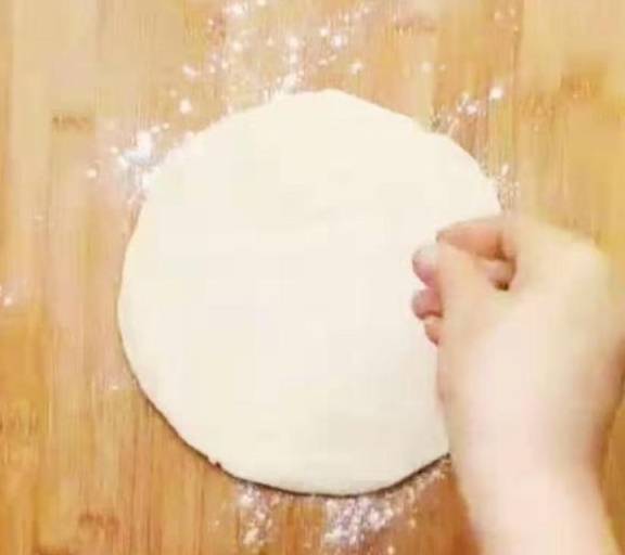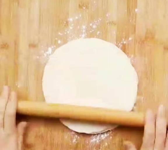 由于手抓饼是冷冻保存的,因此要等它融化后,再取来擀面杖把它擀成薄饼;