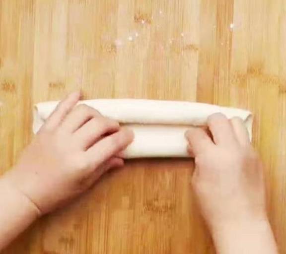 接下来把擀好的手抓饼两端向里卷,在中间处汇合;