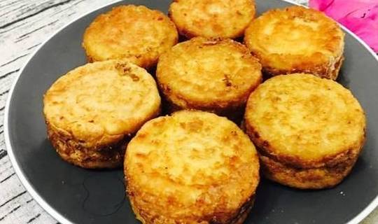 7.当鸡蛋和面饼定型将近断生以后,将它们取出,翻扣在最后倒入的面糊之上,这种煎一会儿后,反复翻面,熟透了就可以出锅啦