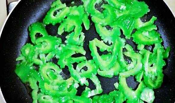 (2)把苦瓜挤干水分。烧锅注少量油,放入苦瓜翻炒1-2分钟。