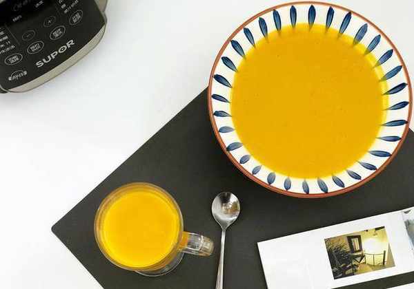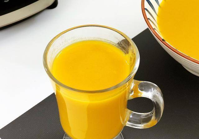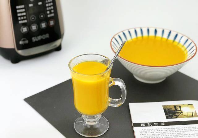 7、破壁机自动做好后,将其倒入杯中即可饮用,喜欢吃甜,可以趁热再放入适量冰糖,不放也可以,南瓜本身自带甜味,这个灵活操作即可,如图所示。