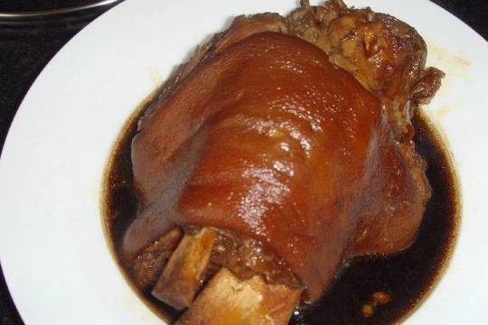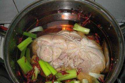加以熟食配方和辅料放入老汤锅中,以老汤淹没猪肘子为好,这时开始大火酱卤猪肘子,待开锅后,转为小火,要去除血沫子,把大火转为小火慢煮约2-3小时,用筷子扎肘子肉厚处,看是否熟透,待猪肘子熟透入味后出锅入盘,盘子底部放些油菜,上面放点葱花或是香菜点缀一下即可。