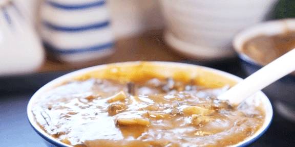 米浆就像淀粉一样,把锅里的食材都勾芡在一起,渐渐地,锅里的食材变得越来越浓稠,一锅米羹就基本做成了。