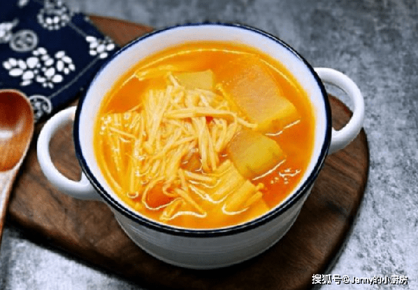 最后放入金针菇煮一分钟,再加盐调味,出锅后撒些葱花,这道汤就做好了。