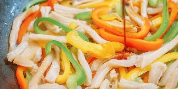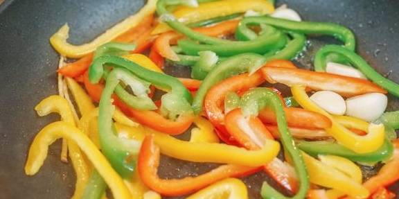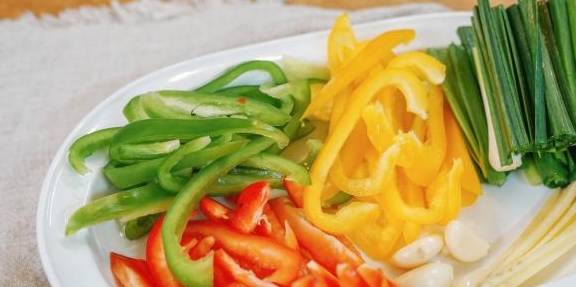 其他配菜(彩椒、蒜苗、蒜、姜)洗干净切好沥干水分,备用。