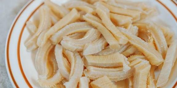 捞出来沥干水分,切成细条状。这时候的牛肚已经是完全煮熟透的了。