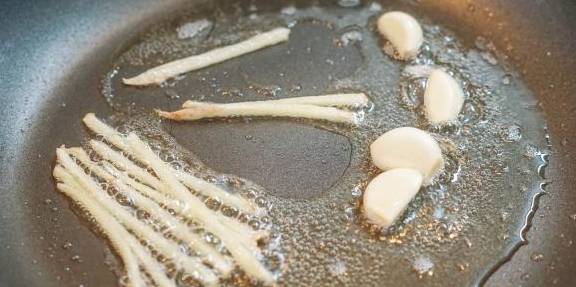 热锅倒油(油量比平时炒菜多点)蒜、姜丝爆岀香味。