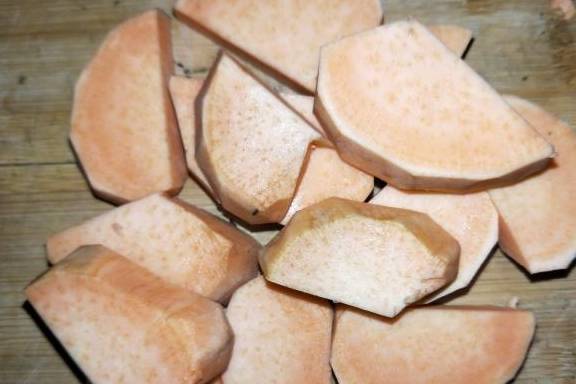 2.把红薯削皮,用水清洗干净,用刀切成片,也可切成块,这个没什么要求。