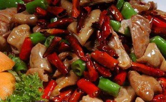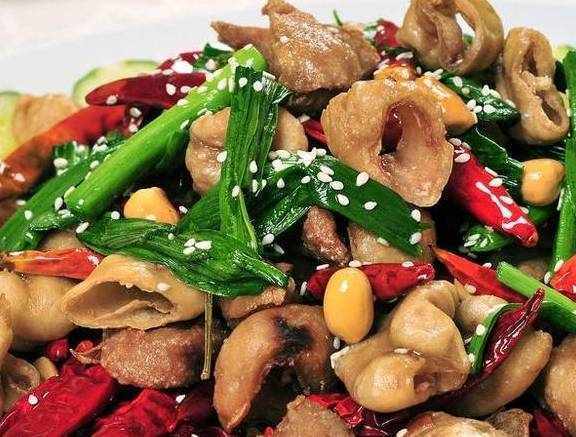 食为民天—肥肠切小块,热锅放多量点的油,油烧全熟倒入肥肠炸至表面变干金黄,捞出沥干油分备用,锅内留适量底油倒入花椒干辣椒小火慢慢炒香,再放入葱姜蒜炒出香味,倒入煸好的肥肠和料酒、生抽翻炒一下,放入青蒜白和砂糖翻炒片刻,最后放入蒜叶、盐、鸡精炒匀关火