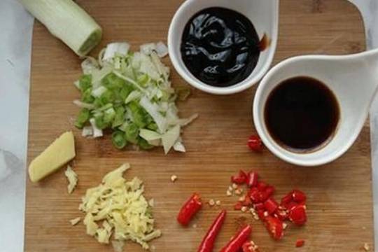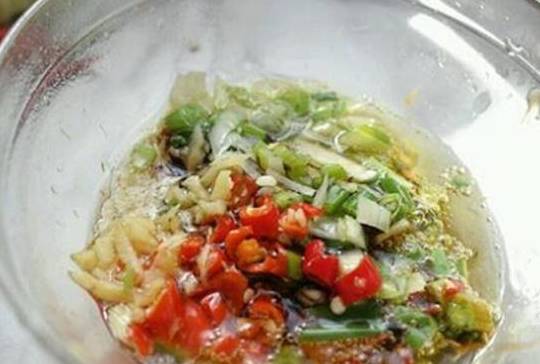 接下来就是做好吃的葱油淋酱:葱、姜、小米椒等剁碎,放入生抽、耗油等搅拌均匀,然后淋上热油,好吃的葱油淋酱就做好啦,是不是特别简单!