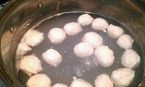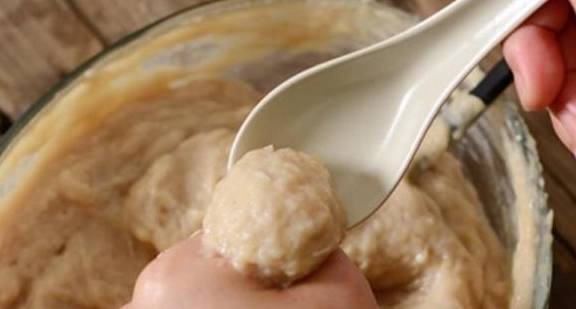 第五步,然后锅中烧开水,转小火微微沸腾,手上打湿,然后把鱼丸泥放在手心挤出来,用勺子刮下成一个丸子,下入锅中煮至定型,颜色变白,浮出水面,然后捞出,过凉水。